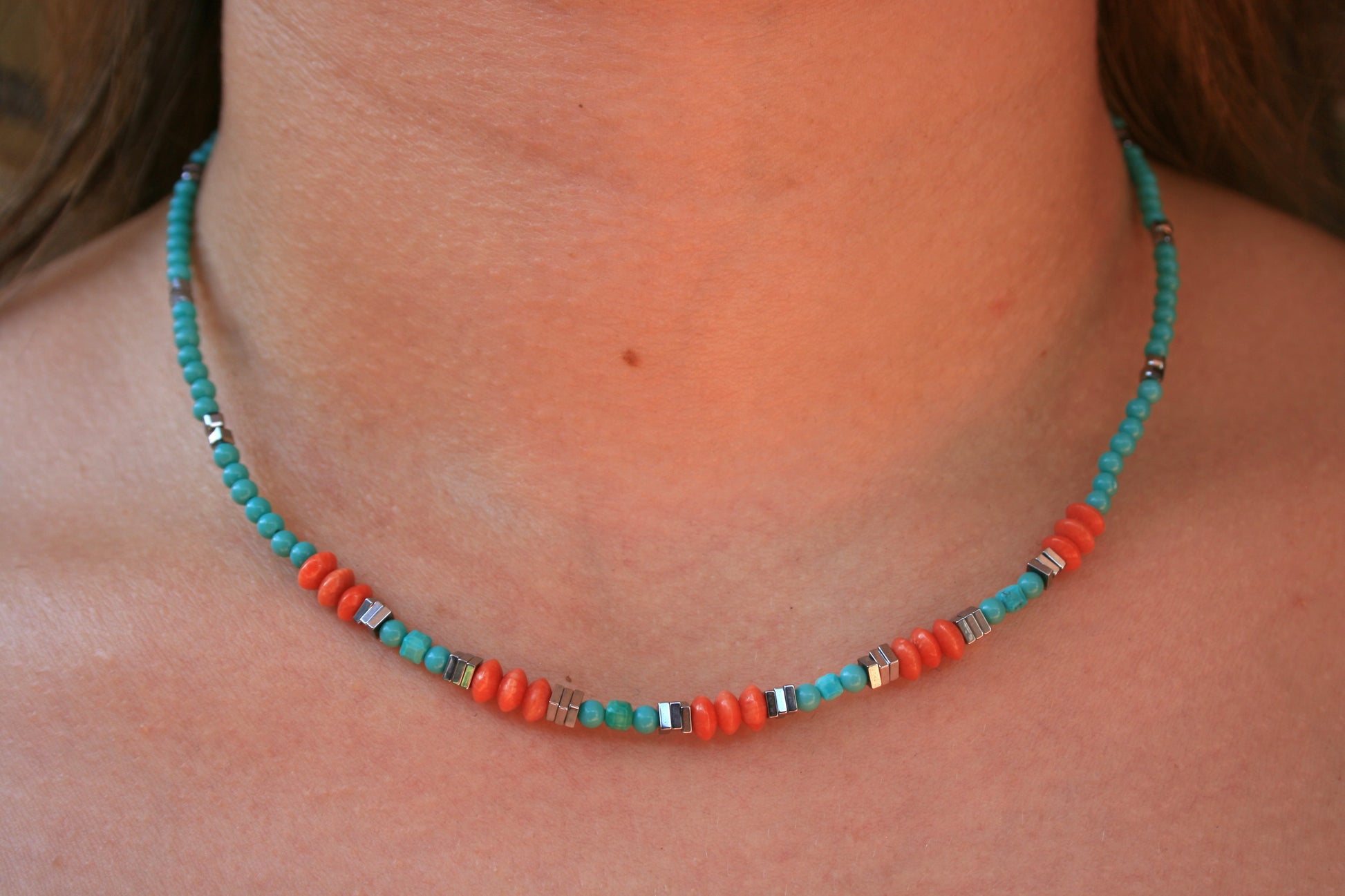 Natural Turquoise/Coral/Pyrite Beads on a 44cm Silver Necklace