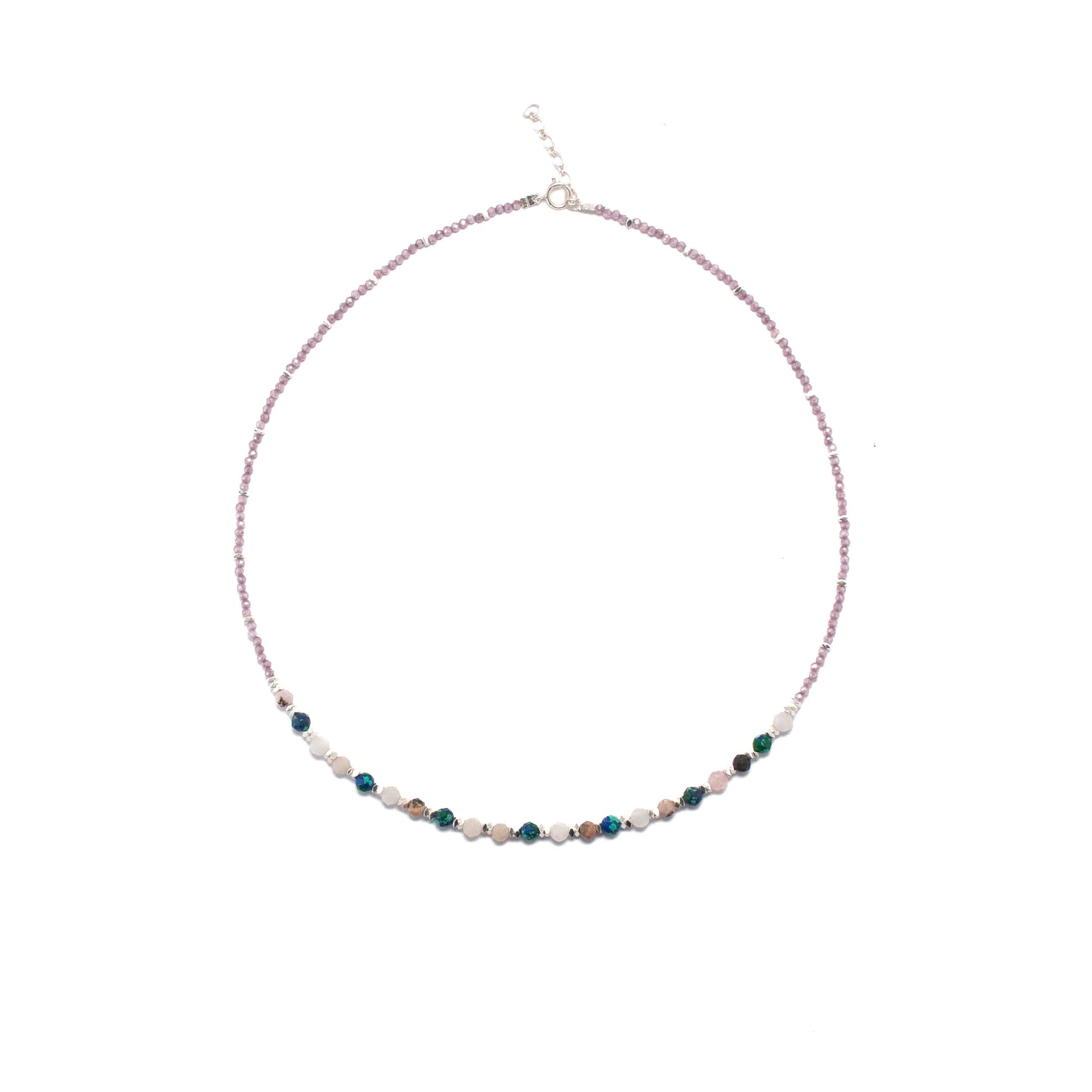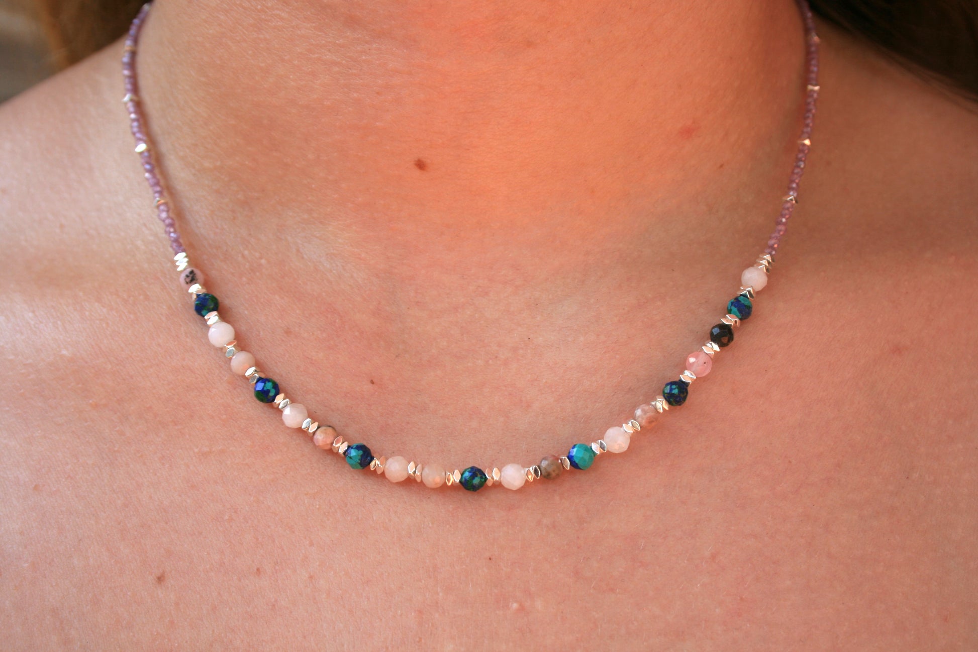 Natural Zircon, Champagne Garnets, Azurite, Rose Quartz and Tourmaline Beads on a 44cm Silver Necklace